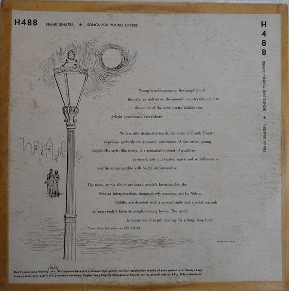 Issued on purple Capitol Long Playing deep groove labels with 3/4 circle band. "Anvil/lathe" symbol stamped in runouts denotes Capitol Records Pressing Plant, Scranton, pressing. Variant features: 1. On labels, this release has "Accompanied By Nelson Riddle" under A4, "Orchestra Conducted By Nelson Riddle" under B4, identical to [r=10012443. ([r=7035389 has "Orchestra Conducted By Nelson Riddle" under A4 and B4; [r=2452924 has "Accompanied By Nelson Riddle" under A4 and B4.) 2. On jacket, this release omits "Capitol Records High Fidelity Recording" white box under Capitol logo at front top right, similar to [r=7035389 and the promo release [r=8363781. 3. On labels, this release has album title typeface non-italicized and appearing below "Frank Sinatra" similar to [r=2452924 and the promo release [r=8363781. First cat. # on labels Second cat. # on jacket This album, along with [r2452938, was also re-released as a 12" LP [r=2018340 with four extra songs added.