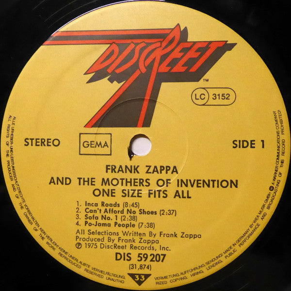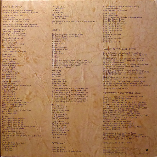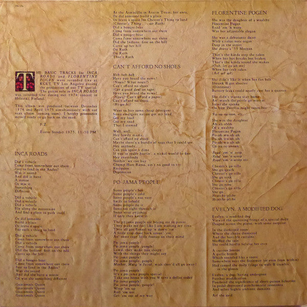 A1. Inca Roads 8:45 A2. Can't Afford No Shoes 2:37 A3. Sofa No. 1 2:38 A4. Po-Jama People 7:38 B1. Florentine Pogen 5:23 B2. Evelyn, A Modified Dog 1:05 B3. San Ber'dino 5:51 B4. Andy 6:03 B5. Sofa No. 2 2:38