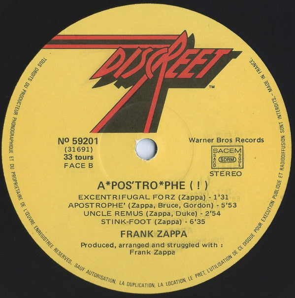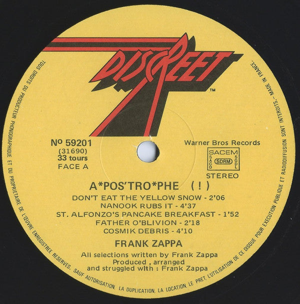 A1. Don't Eat The Yellow Snow 2:06 A2. Nanook Rubs It 4:37 A3. St Alfonzo's Pancake Breakfast 1:52 A4. Father O'Blivion 2:18 A5. Cosmik Debris 4:10 B1. Excentrifugal Forz 1:31 B2. Apostrophe' 5:53 B3. Uncle Remus 2:54 B4. Stink-Foot 6:35