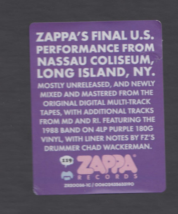 The first posthumous archival release from the 1988 touring band focuses on the historical last show Frank Zappa ever played in the U.S. The live concert material is taken from Long Island, NY; Providence, RI & Towson, MD and newly remixed from the 48 track digital master tapes. It features the first official release of “The Beatles Medley” along with over 25 unreleased performances and liner notes by FZ’s drummer, Chad Wackerman and Vaultmeister, Joe Travers.