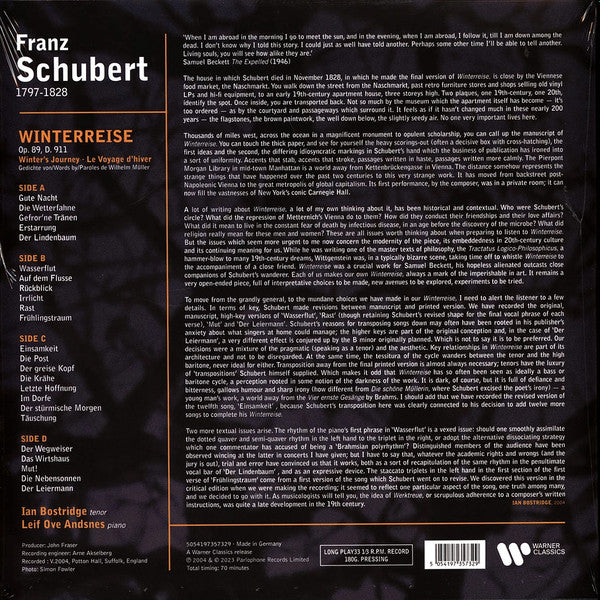 . Winterreise Op. 89, D. 911 1. Gute Nacht 5:312. Die Wetterfahne 1:443. Gefror'ne Tränen 2:154. Erstarrung 2:545. Der Lindenbaum 4:596. Wasserflut 3:487. Auf Dem Flusse 3:288. Rückblick 1:509. Irrlicht 2:2410. Rast 3:2511. Frühlingstraum 4:2412. Einsamkeit 3:1213. Die Post 1:5914. Der Greise Kopf 2:4815. Die Krähe 1:5916. Letzte Hoffnung 1:4817. Im Dorfe 3:1118. Der Stürmische Morgen 0:4819. Täuschung 1:0420. Der Wegweiser 4:0821. Das Wirtshaus 4:1722. Mut 1:2223. Die Nebensonnen 2:4124. Der Leiermann 3:30