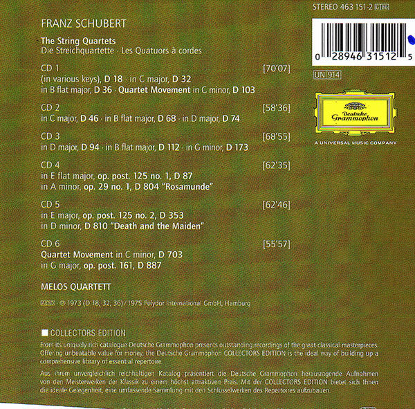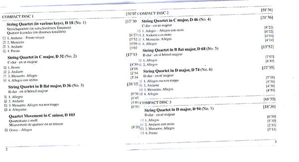 . String Quartet (In Various Keys), D 18 (No. 1) . String Quartet In C Major, D 32 (No. 2) . String Quartet In B Flat Major, D 36 (No. 3) . Quartet Movement In C Minor, D 103 . String Quartet In C Major, D 46 (No. 4) . String Quartet In B Flat Major, D 68 (No. 5) . String Quartet In D Major, D 74 (No. 6) . String Quartet In D Major, D 94 (No. 7) . String Quartet In B Flat Major, D 112 (No. 8) . String Quartet In G Minor, D 173 (No. 9) . String Quartet In E Flat Major, Op. Post. 125 No. 1, D 87 (No. 10) . String Quartet In A Minor, Op. 29 No. 1, D 804 (No. 13) "Rosamunde" . String Quartet In E Major, Op. Post. 125 No. 2, D 353 (No. 11) . String Quartet In D Minor, D 810 (No. 14) "Death And The Maiden" . Quartet Movement In C Minor, D 703 (No. 12) . String Quartet In G Major, Op. Post. 161, D 887 (No. 15)