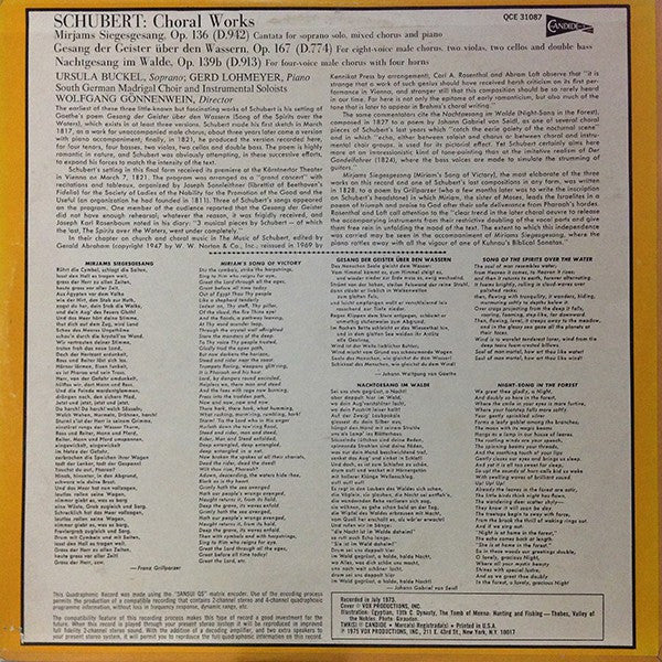 A1. Mirjam Siegesgesang, Op. 136 (D.942) [Cantata For Sobrano Solo, Mixed Chorus And Piano] 19:00 B1. Gesang Der Geister Über Den Wassern, Op. 167 (D.774) [For Eight-voice Male Chorus, Two Violas, Two Cellos And Double Bass] 12:38 B2. Nachtgesang Der Walde, Op. 139 (D.913) [Four Four-Voice Male Chorus With Four Horns] 6:04
