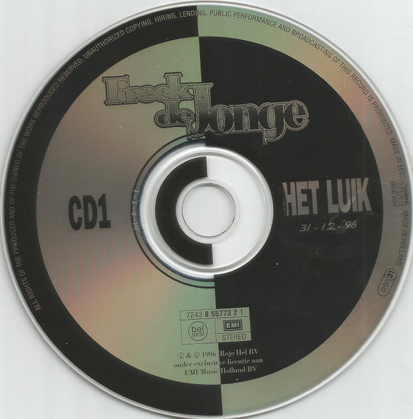 Packaging: slim double jewel case in carded sleeve "Armen mogen deze cd pikken".("Poor people are allowed to steal this CD"). All copies of this release were sent to the stores, but most retailers removed the carded sleeve because of the text. So only a restricted amount of the complete packaging reached the consumer.
