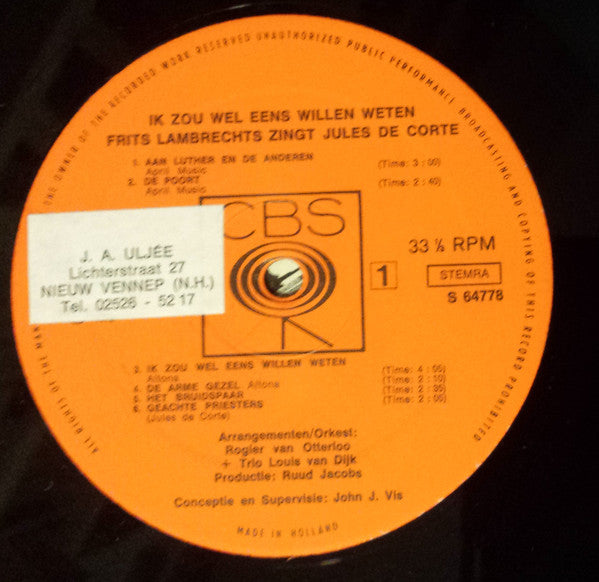 A1. Aan Luther En De Anderen 3:00 A2. De Poort 2:40 A3. Ik Zou Wel Eens Willen Weten 4:05 A4. De Arme Gezel 2:10 A5. Het Bruidspaar 2:35 A6. Geachte Priesters 2:05 B1. Waar Blijft De Tijd 3:05 B2. Kleine Anita 2:20 B3. Rijmloos 3:35 B4. Mater Et Magistra 2:50 B5. Het Liedje Van De Wind 2:27 B6. Het Feest Dat Nooit Gevierd Werd 2:50