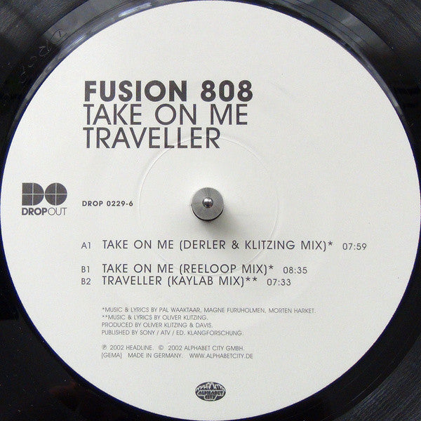 A1. Take On Me (Derler & Klitzing Mix) 7:59 B1. Take On Me (Reeloop Mix) 8:35 B2. Traveller (Kaylab Mix) 7:33