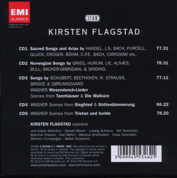 . Sacred Songs And Arias 1-1. Fronde Tenere... Ombra Mai Fu 1-2. I Know That My Redeemer Liveth 1-3. Erbarme Dich, Mein Gott 1-4. Thy Hand, Belinda... When I Am Laid In Earth 1-5. Che Farò Senza Euridice 1-6. Auf, Auf Mein Herz Mit Freude 1-7. Geh Ein, Mein Leib, In Deine Kammer 1-8. Die Güte Gottes 1-9. Bußlied: An Dir Allein 1-10. Passionslied 1-11. Preis Sei Dem Gotte 1-12. Vergiß Mein Nicht 1-13. O Finstre Nacht 1-14. Liebster Herr Jesu 1-15. Komm, Süßer Tod 1-16. Dir, Dir Jehova 1-17. Wie Seh' Ich Dich, Mein Jesu, Bluten 1-18. Sei Nur Still 1-19. Auf, Auf! Zu Gottes Lob! 1-20. Soccorretemi Ch'io Moro 1-21. O Ewigkeit . Norwegian Songs 2-1. En Drøm Op. 48 No. 6 2-2. Tak For Dit Råd Op. 21 No. 4 2-3. Våren Op. 33 No. 2 2-4. Fra Monte Pincio Op. 39 No. 1 2-5. Guten Op. 33 No. 1 2-6. Eros Op. 70 No. 1 2-7. Ved Rundarne Op. 33 No. 9 2-8. Ein Traum Op. 48 No. 6 2-9. En Svane Op. 25 No. 2 2-10. Den Særde Op. 33 No. 3 2-11. Men En Vandlilje Op. 25 No. 4 2-12. Prinsessen 2-13. Langs Ei Å Op. 33 No. 5 2-14. Mens Jeg Venter Op. 60 No. 3 2-15. Med En Primula Veris Op. 25 No. 4 2-16. Og Jeg Vil Ha Mig En Hjertenskjær Op. 60 No. 5 2-17. Modersorg Op. 15 No. 4 2-18. Solveigs Sang (Peer Gynt, Act I) 2-19. Blonde Nætter Op. 13 No. 1 2-20. Sne 2-21. Lykken Mellom To Mennesker 2-22. Sæterjentens Søndag 2-23. Millom Rosor Op. 39 No. 4 2-24. Mot Kveld Op. 42 No. 7 2-25. Majnat Op. 22 No. 3 . Songs 3-1. Die Allmacht D852 3-2. Frühlingsglaube D686 3-3. Wanderers Nachtlied II D768 3-4. Die Ehre Gottes Aus Der Natur Op. 48 No. 4 3-5. Seitdem Dein Aug' Op. 17 No. 1 3-6. Cäcilie Op. 27 No. 2 3-7. Love Went A-Riding 3-8. Gudrid Stod Ved Stoveglas Op. 11 No. 2 3-9. Natt Op. 4 No. 1 3-10. Regn Op. 6 No. 2 3-11. Hjuring-Lokk Op. 8 No. 5 3-12. Spinnvettir Op. 10 No. 1 3-13. Baan Sull Op. 11 No. 1 3-14. Alle Mann Hadde Fota Op. 21 No. 2 . Wesendonck-Lieder 3-15. I. Der Engel 3-16. II. Stehe Still! 3-17. III. Im Treibhaus 3-18. IV. Schmerzen 3-19. V. Träume . Richard Wagner Scenes 3-20. Allmächt'ge Jungfrau (Tannhäuser) 3-21. Siegmund! Sieh Auf Mich! (Die Walküre) 4-1. Heil Dir, Sonne! (Siegfried) 4-2. Prologue (Götterdämmerung) 4-3. Helle Wehr! Heilige Waffe! (Götterdämmerung) 4-4. Immolation Scene (Götterdämmerung) 5-1. Doch Nun Von Tristan (Tristan Und Isolde) 5-2. Hörst Du Sie Noch? (Tristan Und Isolde) 5-3. Isolde! Tristan! Geliebter (Tristan Und Isolde) 5-4. O Sink Hernieder, Nacht Der Liebe (Tristan Und Isolde) 5-5. Mild Und Leise Wie Er Lächelt (Tristan Und Isolde)