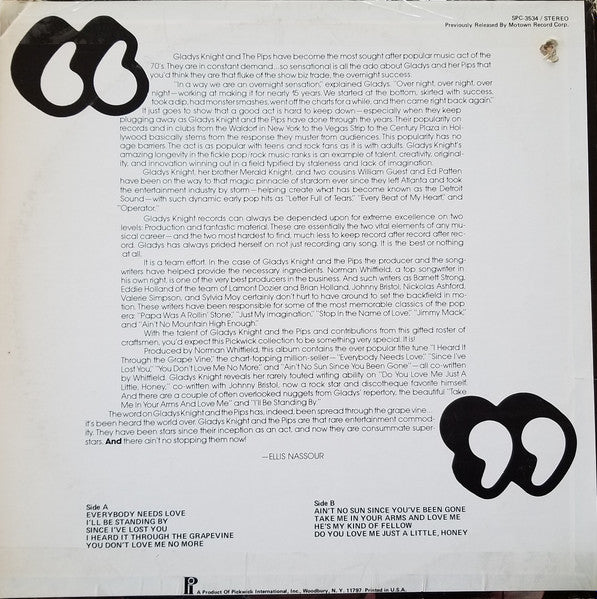 A1. Everybody Needs Love 2:57 A2. I'll Be Standing By 2:31 A3. Since I've Lost You 2:33 A4. I Heard It Through The Grapevine 2:53 A5. You Don't Love Me No More 2:36 B1. Ain't No Sun Since You've Been Gone 2:39 B2. Take Me In Your Arms And Love Me 2:55 B3. He's My Kind Of Fellow 2:55 B4. Do You Love Me Just A Little, Honey 2:59