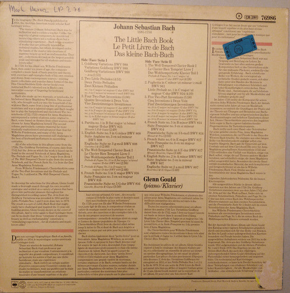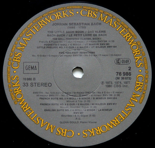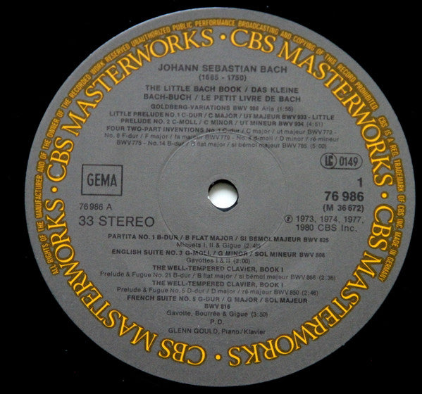 A1. Goldberg Variations - Aria (BWV 988) 1:53 . Two Little Preludes A2.a. Little Prelude No. 1 In C Major, (BWV 933) 4:51 A2.b. Little Prelude No. 2 In C Major, (BWV 934) . Four Two-Part Inventions 5:00 A3.a. No. 1 In C Major, (BWV 772) A3.b. No. 8 In F Major, (BWV 779) A3.c. No. 4 In D Minor, (BWV 775) A3.d. No. 14 In B-Flat Major, (BWV 785) . - A4. Partita No. 1 In B-Flat Major - Minutes I, II & Gigue, (BWV 825) 2:49 A5. English Suite No. 3 In G Minor - Gavottes I & II (BWV 808) 2:00 A6. Well-Tempered Clavier, Book I - Prelude And Fugue No. 21 In B-Flat Major (BWV 866) 2:36 A7. Well-Tempered Clavier, Book I - Prelude And Fugue No. 5 In D Major (BWV 850) 2:46 A8. French Suite No. 5 In G Major - Gavotte, Bourrée, Gigue (BWV 816) 3:50 B1. Well-Tempered Clavier, Book I- Prelude And Fugue No. 1 In C Major (BWV 846) 4:18 B2.a. Fughetta In C Minor(BWV 961) 4:10 B2.b. Little Prelude No. 1 In C Major (BWV 924) . Five Two-Part Inventions: 5:58 B3.a. No. 10 In G Major (BWV 781) B3.b. No. 3 In D Major (BWV 774) B3.c. No. 13 In A Major (BWV 784) B3.d. No. 6 In E Major (BWV 777) B3.e. No. 15 In B Minor (BWV 786) . - B4. French Suite No. 3 In B Minor - Minuet: Bourrée; Gigue (BWV 814) 2:03 B5. French Suite No. 6 In E Major - Minuet; Bourrée; Gigue (BWV 817) 3:48 B6. English Suite No. 2 In A Minor - Bourrée I & II; Gigue (BWV 811) 5:40