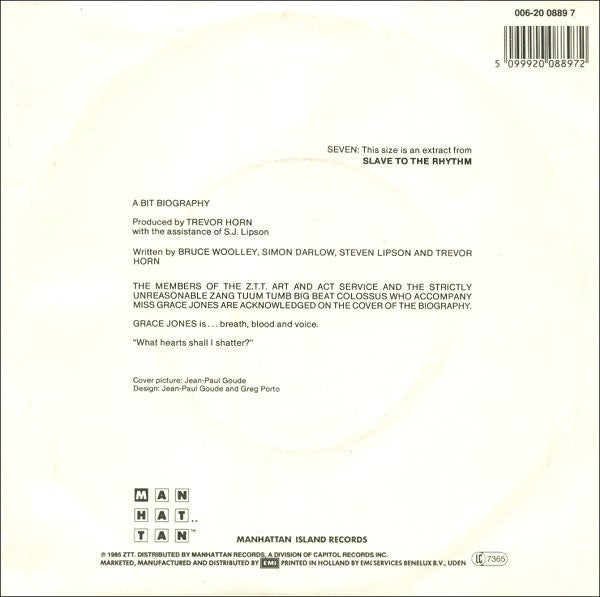 ℗ 1985 ZTT, Distributed by Manhattan Records, a division of Capitol Records, Inc. Made in EEC. Excerpts from 'Slave to the Rhythm' the album from Grace Jones. The 'copyright warnings' on the rim of the label are in English and German.