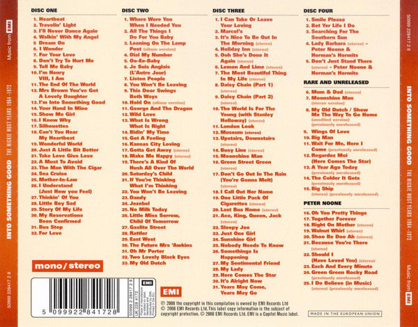 1-1. Herman's Hermits - Heartbeat 1-2. Herman's Hermits - Travelin' Light 1-3. Herman's Hermits - I'll Never Dance Again 1-4. Herman's Hermits - Walkin' With My Angel 1-5. Herman's Hermits - Dream On 1-6. Herman's Hermits - I Wonder 1-7. Herman's Hermits - For Your Love 1-8. Herman's Hermits - Don't Try To Hurt Me 1-9. Herman's Hermits - Tell Me Baby 1-10. Herman's Hermits - I'm Henry VIII, I Am 1-11. Herman's Hermits - The End Of The World 1-12. Herman's Hermits - Mrs Brown You've Got A Lovely Daughter 1-13. Herman's Hermits - I'm Into Something Good 1-14. Herman's Hermits - Your Hand In Mine 1-15. Herman's Hermits - Show Me Girl 1-16. Herman's Hermits - I Know Why 1-17. Herman's Hermits - Silhouettes 1-18. Herman's Hermits - Can't Your Hear My Heartbeat 1-19. Herman's Hermits - Wonderful World 1-20. Herman's Hermits - Just A Little Bit Better 1-21. Herman's Hermits - Take Love Give Love 1-22. Herman's Hermits - A Must To Avoid 1-23. Herman's Hermits - The Man With The Cigar 1-24. Herman's Hermits - Sea Cruise 1-25. Herman's Hermits - Mother-In-Law 1-26. Herman's Hermits - I Understand (Just How Much You Feel) 1-27. Herman's Hermits - Thinkin' Of You 1-28. Herman's Hermits - Little Boy Sad 1-29. Herman's Hermits - Story Of My Life 1-30. Herman's Hermits - My Reservations Been Confirmed 1-31. Herman's Hermits - Bus Stop 1-32. Herman's Hermits - For Love 2-1. Herman's Hermits - Where Were You When I Needed You 2-2. Herman's Hermits - All The Things I Do For You Baby 2-3. Herman's Hermits - Leaning On The Lamp Post (Album Version) 2-4. Herman's Hermits - Dial My Number 2-5. Herman's Hermits - Oo-Ee-Baby 2-6. Herman's Hermits - Je Suis Anglais (L'Autre Jour) 2-7. Herman's Hermits - Listen People 2-8. Herman's Hermits - You Won't Be Leaving 2-9. Herman's Hermits - This Door Swings Both Ways 2-10. Herman's Hermits - Hold On (Album Version) 2-11. Herman's Hermits - George And The Dragon 2-12. Herman's Hermits - Wild Love 2-13. Herman's Hermits - What Is Wrong What Is Right 2-14. Herman's Hermits - Bidin' My Time 2-15. Herman's Hermits - Got A Feeling 2-16. Herman's Hermits - Kansas City Loving 2-17. Herman's Hermits - Gotta Get Away (Stereo) 2-18. Herman's Hermits - Make Me Happy (Stereo) 2-19. Herman's Hermits - There's A Kind Of Hush All Over The World 2-20. Herman's Hermits - Saturday's Child 2-21. Herman's Hermits - If You're Thinking What I'm Thinking 2-22. Herman's Hermits - You Won't Be Leaving 2-23. Herman's Hermits - Dandy 2-24. Herman's Hermits - Jezebel 2-25. Herman's Hermits - No Milk Today 2-26. Herman's Hermits - Little Miss Sorrow, Child Of Tomorrow 2-27. Herman's Hermits - Gaslite Street 2-28. Herman's Hermits - Rattler 2-29. Herman's Hermits - East West 2-30. Herman's Hermits - The Future Mrs 'Awkins 2-31. Herman's Hermits - Oh Mr Porter 2-32. Herman's Hermits - Two Lovely Black Eyes 2-33. Herman's Hermits - My Old Dutch 3-1. Herman's Hermits - I Can Take Or Leave Your Loving 3-2. Herman's Hermits - Marcel's 3-3. Herman's Hermits - It's Nice To Be Out In The Morning (Stereo) 3-4. Herman's Hermits - Holiday Inn (Stereo) 3-5. Herman's Hermits - Ooh She's Done It Again (Stereo) 3-6. Herman's Hermits - Lemon And Lime (Stereo) 3-7. Herman's Hermits - The Most Beautiful Thing In My Life (Stereo) 3-8. Herman's Hermits - Daisy Chain (Part 1) (Stereo) 3-9. Herman's Hermits - Daisy Chain (Part 2) (Stereo) 3-10. Herman's Hermits, Stanley Holloway - The World Is For The Young (Stereo) 3-11. Herman's Hermits - London Look 3-12. Herman's Hermits - Museum (Stereo) 3-13. Herman's Hermits - Upstairs, Downstairs (Stereo) 3-14. Herman's Hermits - Busy Line (Stereo) 3-15. Herman's Hermits - Moonshine Man 3-16. Herman's Hermits - Green Street Green (Stereo) 3-17. Herman's Hermits - Don't Go Out In The Rain (You're Gonna Melt) (Stereo) 3-18. Herman's Hermits - I Call Out Her Name 3-19. Herman's Hermits - One Little Pack Of Cigarettes (Stereo) 3-20. Herman's Hermits - Last Bus Home (Stereo) 3-21. Herman's Hermits - Ace, King, Queen, Jack (Stereo) 3-22. Herman's Hermits - Sleepy Joe 3-23. Herman's Hermits - Just One Girl 3-24. Herman's Hermits - Sunshine Girl 3-25. Herman's Hermits - Nobody Needs To Know 3-26. Herman's Hermits - Something Is Happening 3-27. Herman's Hermits - My Sentimental Friend 3-28. Herman's Hermits - My Lady 3-29. Herman's Hermits - Here Comes The Star 3-30. Herman's Hermits - It's Alright Now 3-31. Herman's Hermits - Years May Come, Years May Go 4-1. Herman's Hermits - Smile Please 4-2. Herman's Hermits - Bet Yer Life I Do 4-3. Herman's Hermits - Searching For The Southern Sun 4-4. Peter Noone, Herman's Hermits - Lady Barbara (Stereo) 4-5. Peter Noone, Herman's Hermits - Don't Just Stand There (Stereo) . Rare And Unreleased 4-6. Herman's Hermits - Mum & Dad (Stereo) 4-7. Herman's Hermits - Moonshine Man (Stereo) 4-8. Herman's Hermits - My Old Dutch / Show Me The Way To Go Home (Unedited Version) (Previously Unreleased) 4-9. Herman's Hermits - Wings Of Love 4-10. Herman's Hermits - Big Man 4-11. Herman's Hermits - Wait For Me, Here I Come (Previously Unreleased) 4-12. Herman's Hermits - Regardez Moi (Here Comes The Star) 4-13. Herman's Hermits - A Year Ago Today (Previously Unreleased) 4-14. Herman's Hermits - The Colder It Gets (Previously Unreleased) 4-15. Herman's Hermits - Big Ship (Stereo) (Previously Unreleased) . Peter Noone 4-16. Peter Noone - Oh You Pretty Things 4-17. Peter Noone - Together Forever 4-18. Peter Noone - Right On Mother (Stereo) 4-19. Peter Noone - Walnut Whirl (Stereo) 4-20. Peter Noone - Shoo Be Doo Ah (Stereo) 4-21. Peter Noone - Because You're There (Stereo) 4-22. Peter Noone - Should I (Have Loved You) (Stereo) 4-23. Peter Noone - Each And Every Minute 4-24. Peter Noone - Green Green Rocky Road (Previously Unreleased) 4-25. Peter Noone - I Do Believe (In Music) (Stereo) (Previously Unreleased)