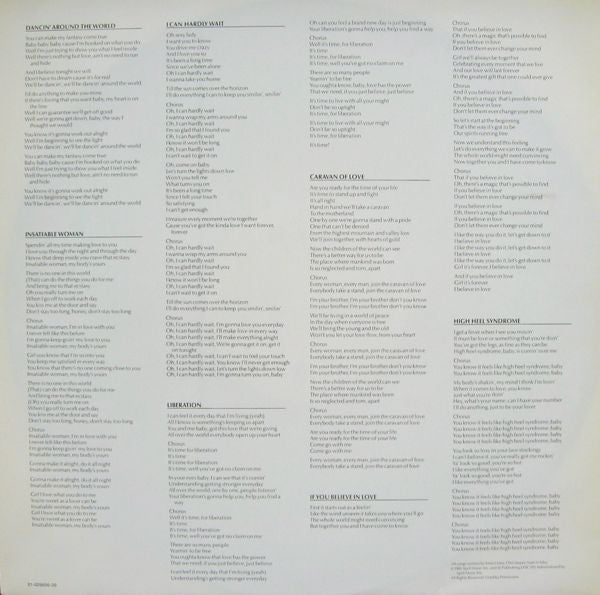 A1. Dancin' Around The World 6:05 A2. Insatiable Woman 5:12 A3. I Can Hardly Wait 4:13 A4. Liberation 4:28 B1. Caravan Of Love 5:43 B2. If You Believe In Love 4:03 B3. High Heel Syndrome 5:07