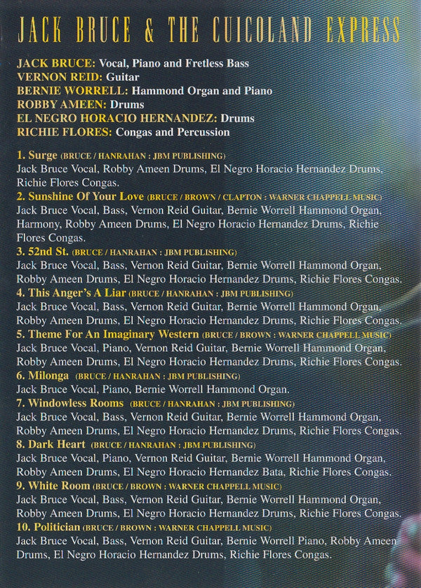 1. Surge 2. Sunshine Of Your Love 3. 52nd St. 4. This Anger's A Liar 5. Theme For An Imaginary Western 6. Milonga 7. Windowless Rooms 8. Dark Heart 9. White Room 10. Politician