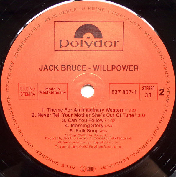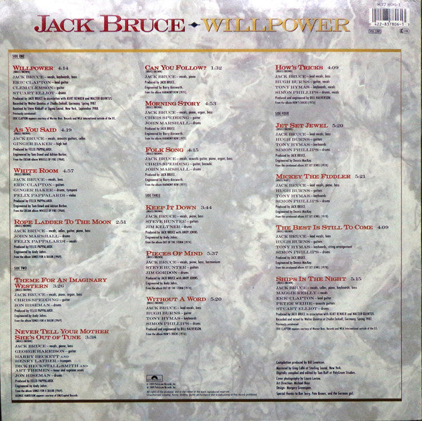 A1. Willpower 4:18 A2. As You Said 4:21 A3. White Room 5:01 A4. Rope Ladder To The Moon 2:53 B1. Theme For An Imaginary Western 3:28 B2. Never Tell Your Mother She's Out Of Tune 3:40 B3. Can You Follow 1:31 B4. Morning Story 4:55 B5. Folk Song 4:17 C1. Keep It Down 3:45 C2. Pieces Of Mind 5:40 C3. Without A Word 5:21 C4. How's Tricks 4:12 D1. Jet Set Jewel 5:22 D2. Mickey The Fiddler 5:24 D3. The Best Is Still To Come 4:11 D4. Ships In The Night 5:16