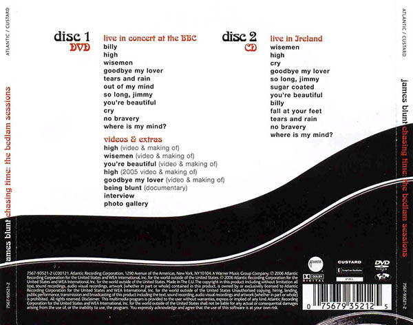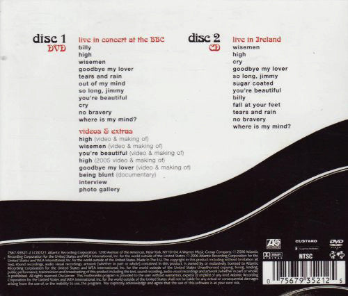. Live In Concert At The BBC DVD-1. Billy DVD-2. High DVD-3. Wisemen DVD-4. Goodbye My Lover DVD-5. Tears And Rain DVD-6. Out Of My Mind DVD-7. So Long, Jimmy DVD-8. You're Beautiful DVD-9. Cry DVD-10. No Bravery DVD-11. Where Is My Mind? . Videos & Extras DVD-12. High (Video And Making Of) DVD-13. Wisemen (Video And Making Of) DVD-14. You're Beautiful (Video And Making Of) DVD-15. High (2005 Video And Making Of) DVD-16. Goodbye My Lover (Video And Making Of) DVD-17. Being Blunt (Documentary) DVD-18. Interview . Live In Ireland CD-1. Wisemen CD-2. High CD-3. Cry CD-4. Goodbye My Lover CD-5. So Long, Jimmy CD-6. Sugar Coated CD-7. You're Beautiful CD-8. Billy CD-9. Fall At Your Feet CD-10. Tears And Rain CD-11. No Bravery CD-12. Where Is My Mind?