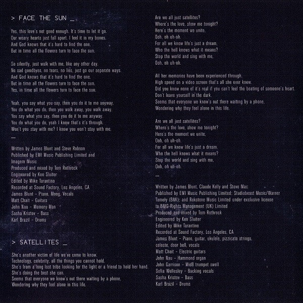 1. Face The Sun 4:022. Satellites 3:133. Bonfire Heart 3:594. Heart To Heart 3:305. Miss America 3:066. The Only One 3:447. Sun On Sunday 3:188. Bones 2:519. Always Hate Me 3:3810. Postcards 4:4911. Blue On Blue 3:50