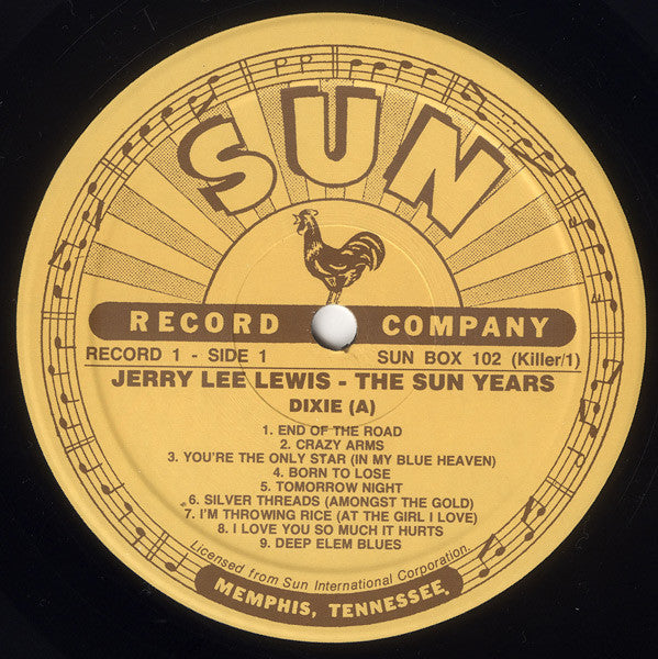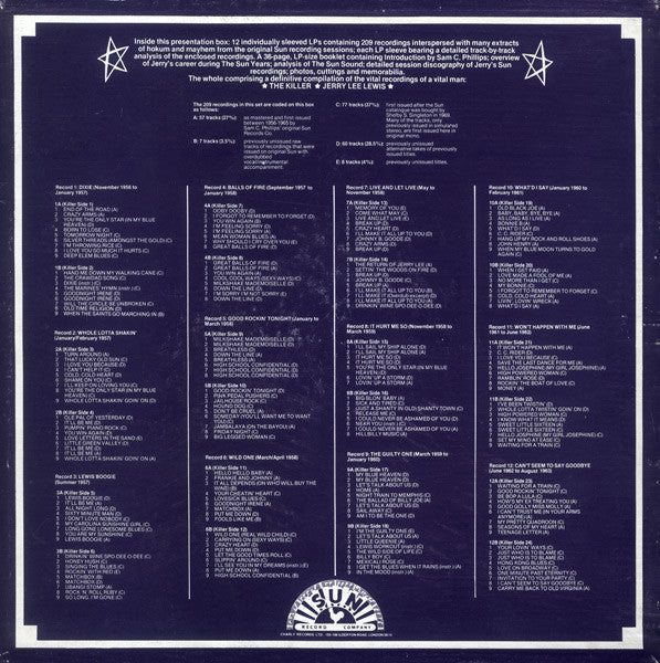A1. End Of The Road (A) 1:47 A2. Crazy Arms (A) 2:43 A3. You're The Only Star (In My Blue Heaven) (D) 2:37 A4. Born To Lose (C) 2:39 A5. Tomorrow Night (C) 2:55 A6. Silver Threads (Amongst The Gold) (C) 2:04 A7. I'm Throwing Rice (C) 2:13 A8. I Love You So Much It Hurts (C) 2:17 A9. Deep Elem Blues (C) 2:44 B1. Hand Me Down My Walking Cane (C) 2:17 B2. The Crawdad Song (C) 1:48 B3. Dixie (Instr.) (C) 1:30 B4. The Marines' Hymn (Instr.) (C) 2:24 B5. Goodnight Irene (D) 2:59 B6. Goodnight Irene (D) 3:02 B7. Will The Circle Be Unbroken (C) 2:22 B8. Old Time Religion (D) 1:52 B9. When The Saints Go Marching In (B) 2:08 . Record 2: Whole Lotta' Shakin' (January/February 1957) C1. Turn Around (A) 2:48 C2. That Lucky Old Sun (C) 3:08 C3. I Love You Because (D) 3:01 C4. I Can't Help It (C) 2:52 C5. Cold, Cold Heart (D) 3:05 C6. Shame On You (C) 2:08 C7. I'll Keep On Loving You (C) 1:49 C8. You're The Only Star (In My Blue Heaven) (C) 2:21 C9. Whole Lotta Shakin' Goin' On (D) 2:41 D1. Ole Pal Of Yesterday (D) 2:36 D2. It'll Be Me (D) 2:27 D3. Pumpin' Piano Rock (C) 2:03 D4. You Win Again (D) 2:05 D5. Love Letters In The Sand (E) 2:01 D6. Little Green Valley (D) 1:52 D7. It'll Be Me (D) 3:45 D8. It'll Be Me (A) 2:44 D9. Whole Lotta Shakin' Goin' On (A) 2:52 . Record 3: Lewis Boogie (Summer 1957) E1. Lewis Boogie (D) 1:57 E2. It'll Be Me (A) 2:12 E3. All Night Long (D) 2:00 E4. Sixty Minute Man (D) 1:47 E5. I Don't Love Nobody (C) 2:08 E6. My Carolina Sunshine Girl (C) 1:51 E7. Long Gone Lonesome Blues (C) 2:02 E8. You Are My Sunshine (C) 2:23 E9. Lewis Boogie (A) 1:58 F1. Drinkin' Wine Spo-Dee-O-Dee (C) 2:35 F2. Honey Hush (C) 2:03 F3. Singing The Blues (C) 2:06 F4. Rockin' With Red (E) 2:17 F5. Matchbox (B) 1:42 F6. Matchbox (D) 1:49 F7. Ubangi Stomp (A) 1:47 F8. Rock 'N' Roll Ruby (C) 1:58 F9. So Long, I'm Gone (C) 2:11 . Record 4: Balls Of Fire (September 1957 To January 1958) G1. Ooby Dooby (D) 1:57 G2. I Forgot To Remember To Forget (D) 3:08 G3. You Win Again (B) 2:53 G4. I'm Feeling Sorry (D) 2:34 G5. I'm Feeling Sorry (A) 2:39 G6. Mean Woman Blues (A) 2:24 G7. Why Should I Cry Over You (E) 2:34 G8. Great Balls Of Fire (D) 5:52 H1. Great Balls Of Fire (D) 2:58 H2. Great Balls Of Fire (A) 2:03 H3. You Win Again (A) 2:55 H4. Cool Cool Ways (Sexy Ways) (C) 3:06 H5. Milkshake Mademoiselle (D) 2:22 H6. Down The Line (D) 2:54 H7. I'm Sorry I'm Not Sorry (E) 2:35 H8. Down The Line (D) 2:02 . Record 5: Good Rockin' Tonight (January To March 1958) I1. Milkshake Mademoiselle (D) 2:24 I2. Milkshake Mademoiselle (D) 2:41 I3. Breathless (D) 2:34 I4. Down The Line (A) 2:12 I5. Breathless (A) 2:41 I6. High School Confidential (D) 2:29 I7. High School Confidential (D) 2:42 I8. High School Confidential (D) 2:43 J1. Good Rockin' Tonight (D) 2:41 J2. Pink Pedal Pushers (C) 2:06 J3. Jailhouse Rock (C) 1:56 J4. Hound Dog (C) 1:24 J5. Don't Be Cruel (A) 1:58 J6. Someday (You'll Want Me To Want You) (C) 2:44 J7. Jambalaya (On The Bayou) (A) 1:58 J8. Friday Night (C) 1:42 J9. Big Legged Woman (C) 2:24 . Record 6: Wild One (March/April 1958) K1. Hello Hello Baby (A) 3:22 K2. Frankie And Johnny (A) 2:32 K3. It All Depends (On Who Will Buy The Wine) (B) 2:59 K4. Your Cheatin' Heart (C) 2:10 K5. Lovesick Blues (C) 2:08 K6. Goodnight Irene (A) 2:52 K7. Matchbox (A) 1:42 K8. Put Me Down (D) 2:21 K9. Fools Like Me (B) 3:10 L1. Wild One (Real Wild Child) (C) 1:50 L2. Carrying On (Sexy Ways) (C) 1:58 L3. Crazy Heart (D) 3:06 L4. Put Me Down (D) 1:54 L5. Let The Good Times Roll (C) 2:10 L6. Slippin' Around (C) 2:56 L7. I'll See You In My Dreams (Instr.) (E) 2:44 L8. Put Me Down (A) 2:09 L9. High School Confidential (B) 3:31 . Record 7: Live And Let Live (May To November 1958) M1. Memory Of You (E) 2:08 M2. Come What May (C) 2:01 M3. Live And Let Live (E) 0:36 M4. Break Up (D) 2:24 M5. Crazy Heart (D) 3:20 M6. I'll Make It All Up To You (D) 3:23 M7. Johnny B. Goode (D) 1:53 M8. Crazy Arms (D) 2:42 M9. Break Up (D) 2:39 N1. The Return Of Jerry Lee (A) 2:32 N2. Settin' The Woods On Fire (D) 2:24 N3. Break Up (D) 2:29 N4. Johnny B. Goode (C) 2:39 N5. Break Up (A) 2:37 N6. I'll Make It All Up To You (B) 3:03 N7. I'll Make It (Overdub Excerpt) (D) 1:49 N8. I'll Make It All Up To You (A) 3:03 N9. Drinkin' Wine Spo-Dee-O-Dee (D) 3:00 . Record 8: It Hurt Me So (November 1958 To March 1959) O1. I'll Sail My Ship Alone (D) 2:13 O2. I'll Sail My Ship Alone (A) 2:07 O3. It Hurt Me So (D) 4:09 O4. It Hurt Me So (D) 3:48 O5. You're The Only Star (In My Blue Heaven) (D) 3:05 O6. Lovin' Up A Storm (D) 2:04 O7. Lovin' Up A Storm (A) 1:50 P1. Big Blon' Baby (A) 1:39 P2. Sick And Tired (C) 2:44 P3. (Just A Shanty In Old) Shanty Town (C) 2:29 P4. Release Me (C) 2:08 P5. I Could Never Be Ashamed Of You (D) 3:36 P6. Near You (Instr.) (C) 3:42 P7. I Could Never Be Ashamed Of You (A) 2:23 P8. Hillbilly Music (A) 2:05 . Record 9: The Guilty One (March 1959 To January 1960) Q1. My Blue Heaven (D) 1:56 Q2. My Blue Heaven (D) 1:44 Q3. Let's Talk About Us (D) 3:18 Q4. Home (A) 1:57 Q5. Night Train To Memphis (C) 2:07 Q6. The Ballad Of Billy Joe (A) 2:57 Q7. Let's Talk About Us (D) 2:02 Q8. Sail Away (C) 2:24 Q9. Am I To Be The One (D) 2:51 R1. I'm The Guilty One (E) 2:08 R2. Let's Talk About Us (A) 2:07 R3. Little Queenie (A) 2:23 R4. Lewis Workout (Instr.) (C) 3:11 R5. The Wild Side Of Life (C) 2:45 R6. Billy Boy (C) 2:17 R7. Mexicali Rose (C) 1:33 R8. I Get The Blues When It Rains (Instr.) (A) 2:12 R9. In The Mood (Instr.) (A) 2:18 . Record 10: What'd I Say (January 1960 To February 1961) S1. Old Black Joe (A) 2:04 S2. Baby, Baby, Bye, Bye (A) 1:55 S3. As Long As I Live (A) 2:25 S4. Bonnie B (A) 2:18 S5. What'd I Say (D) 3:18 S6. C.C. Rider (C) 2:36 S7. Hang Up My Rock And Roll Shoes (A) 2:33 S8. John Henry (A) 2:30 S9. When My Blue Moon Turns To Gold Again (C) 2:15 T1. When I Get Paid (A) 2:46 T2. Love Made A Fool Of Me (A) 2:46 T3. No More Than I Get (C) 2:23 T4. My Bonnie (C) 2:33 T5. I Forgot To Remember To Forget (C) 2:11 T6. Cold, Cold Heart (A) 