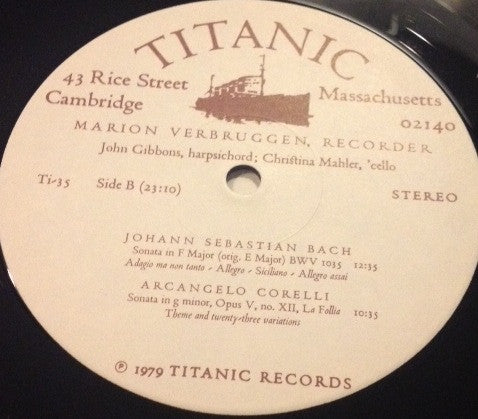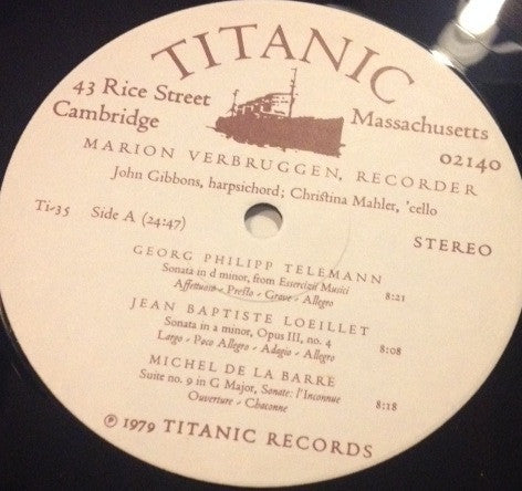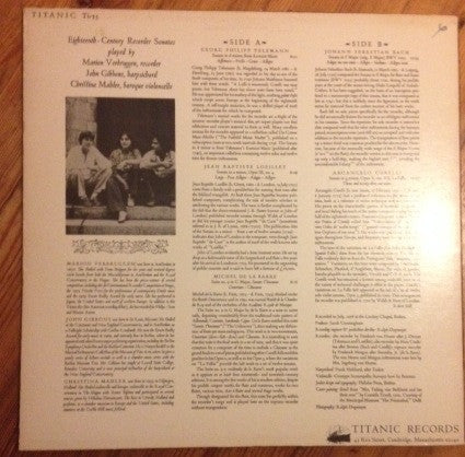Recorders: alto recorder by Friedrich von Heune after J. Denner (Telemann and Loeillet); alto recorder by Hans Coolsma after Bressan (Bach and Corelli); soprano recorder by Frederick Morgan after Stanesby, Jr. (de la Barre). The von Huene and Morgan instruments were lent by Mrs. Ingeborg von Huene.