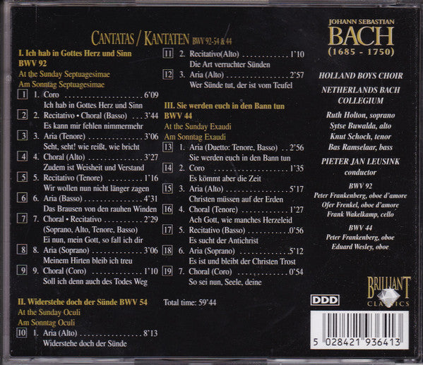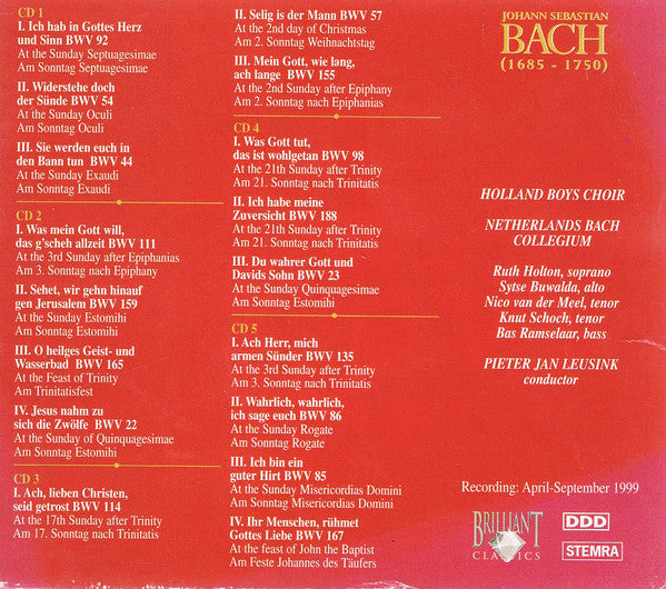 . Ich Hab In Gottes Herz Und Sinn (BWV 92) . Widerstehe Doch Der Sünde (BWV 54) . Sie Werden Euch In Den Bann Tun (BWV 44) . Was Mein Gott Will, Das G'scheh Allzeit (BWV 111) . Sehet, Wir Gehn Hinauf Gen Jerusalem (BWV 159) . O Heilges Geist- Und Wasserbad (BWV 165) . Jesus Nahm Zu Sich Die Zwölfe (BWV 22) . Ach, Lieben Christen, Seid Getrost (BWV 114) . Selig Ist Der Mann (BWV 57) . Mein Gott, Wie Lang, Ach Lange (BWV 155) . Was Gott Tut, Das Ist Wohlgetan (BWV 98) . Ich Habe Meine Zuversicht (BWV 188) . Du Wahrer Gott Und Davids Sohn (BWV 23) . Ach Herr, Mich Armen Sünder (BWV 135) . Wahrlich, Wahrlich, Ich Sage Euch (BWV 86) . Ich Bin Ein Guter Hirt (BWV 85) . Ihr Menschen, Rühmet Gottes Liebe (BWV 167)