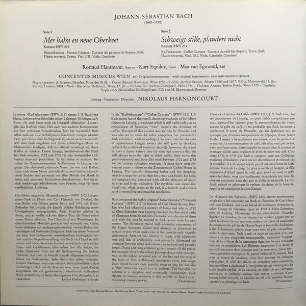 . Mer Hahn En Neue Oberkeet A. Kantate BWV 212, "Bauernkantate" Für Sopran, Bass, Flauto Traverso, Corno, Violine I/II, Viola & Basso Continuo . Schweigt Stille, Plaudert Nicht B. Kantate BWV 211, "Kaffeekantate" Für Sopran, Tenor, Bass, Flauto Traverso, Violine I/II, Viola, Cembalo & Basso Continuo