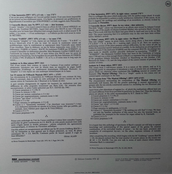 A1. 14 Canons Sur La Basse Goldberg BWV 1087 5:45 A2. 10 Variations Canoniques Extraites De Clavierubung 6 21:03 . 6 Canons Isolés 5:25 B7. Andante En Fa Dièse Mineur BWV 1015 2:47 . 10 Canons De L'Offrande Musicale BWV 1079 15:01