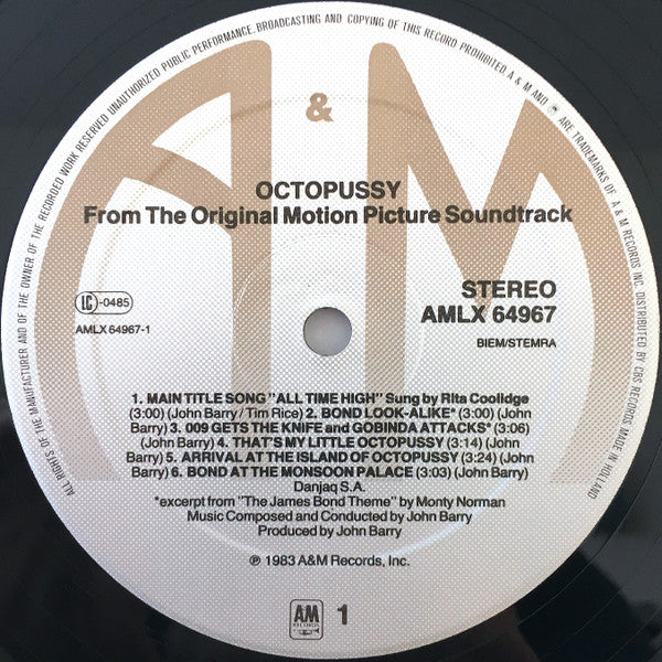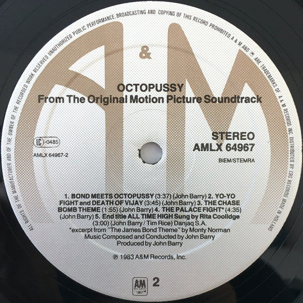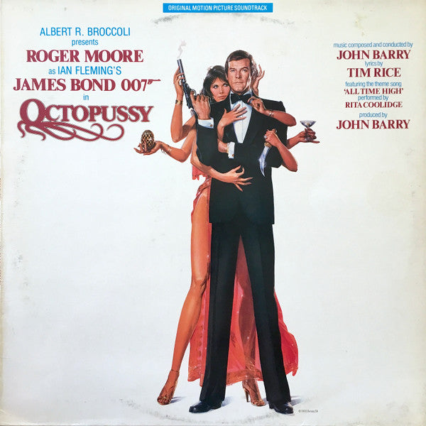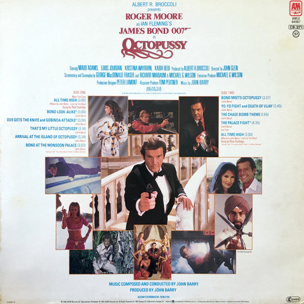 Albert R. Broccoli presents Roger Moore as Ian Fleming's James Bond 007 in Octopussy. Starring Maud Adams, Louis Jourdan, Kristina Wayborn, Kabir Bedi. Produced by Albert R. Broccoli. Directed by John Glen. Screenstory and Screenplay by George MacDonald Fraser and Richard Maibaum & Michael G. Wilson. Executive Producer Michael G. Wilson. Production Designer Peter Lamont. Associate Producer Tom Pevsner. Music by John Barry. ℗ 1983 A&M Records Ltd. © 1983 A&M Records Ltd. © 1983 Danjaq SA - Published by Danjaq SA Distributed by CBS Records / Made In Holland / Distribué en France par CBS Disques Released in company inner sleeve with adverts for other records. The number printed on inner sleeve is 11.49605-4.