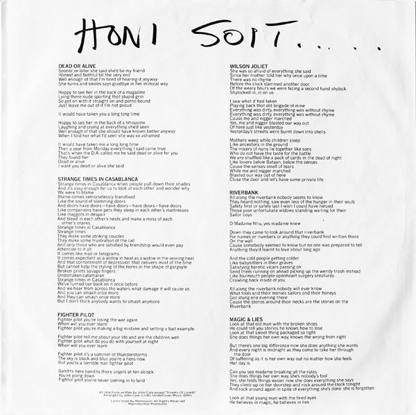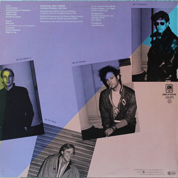 A1. Dead Or Alive 3:51 A2. Strange Times In Casablanca 4:13 A3. Fighter Pilot 3:10 A4. Wilson Joliet 4:23 A5. Streets Of Laredo 3:34 B1. Honi Soit (La Première Leçon De Français) 3:20 B2. Riverbank 6:26 B3. Russian Roulette 5:15 B4. Magic & Lies 3:26