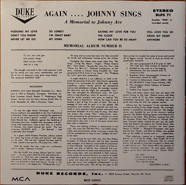 Johnny Ace - Memorial Album (CD, Album, Bon)