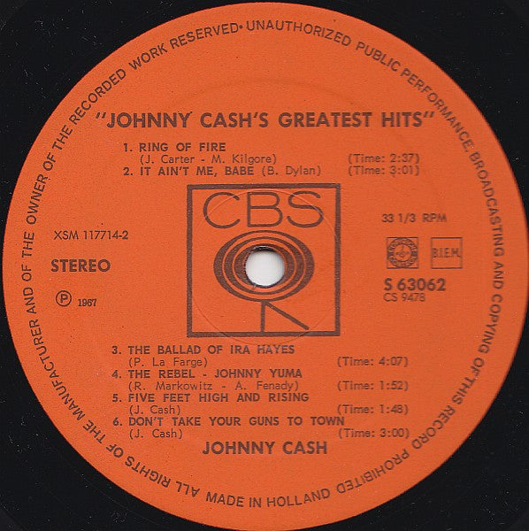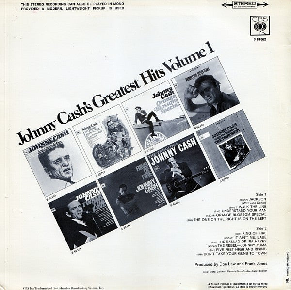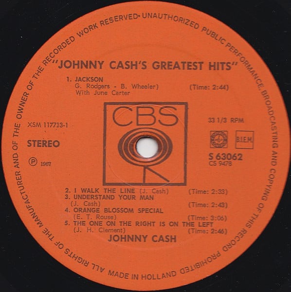 A1. Johnny Cash & June Carter Cash - Jackson 2:44 A2. Johnny Cash - I Walk The Line 2:33 A3. Johnny Cash - Understand Your Man 2:43 A4. Johnny Cash - Orange Blossom Special 3:06 A5. Johnny Cash - The One On The Right Is On The Left 2:46 B1. Johnny Cash - Ring Of Fire 2:37 B2. Johnny Cash - It Ain't Me, Babe 3:01 B3. Johnny Cash - The Ballad Of Ira Hayes 4:07 B4. Johnny Cash - The Rebel - Johnny Yuma 1:52 B5. Johnny Cash - Five Feet High And Rising 1:48 B6. Johnny Cash - Don't Take Your Guns To Town 3:00