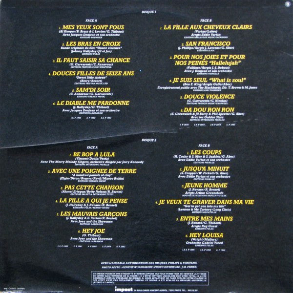 A1. Mes Yeux Sont Fous A2. Les Bras En Croix A3. Il Faut Saisir Sa Chance A4. Douces Filles De Seize Ans A5. Sam'di Soir A6. Le Diable Me Pardonne B1. La Fille Aux Cheveux Clairs B2. San Francisco B3. Pour Nos Joies Et Pour Nos Peines "Hallelujah" B4. Je Suis Seul "What Is Soul" B5. Douce Violence B6. Da Dou Ron Ron C1. Be Bop A Lula C2. Avec Une Poignée De Terre C3. Pas Cette Chanson C4. La Fille A Qui Je Pense C5. Les Mauvais Garçons C6. Hey Joe D1. Les Coups D2. Jusqu'a Minuit D3. Jeune Homme D4. Je Veux Te Graver Dans Ma Vie D5. Entre Mes Mains D6. Hey Louisa