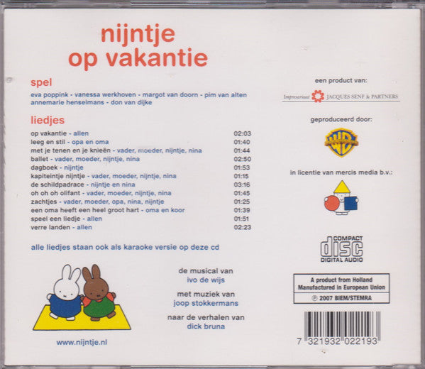 1.. Op Vakantie - Allen 2:032.. Leeg En Stil - Opa En Oma 1:403.. Met Je Tenen En Je Knieën - Vader, Moeder, Nijntje, Nina 1:444.. Ballet - Vader, Moeder, Nijntje, Nina 2:505.. Dagboek - Nijntje 1:536.. Kapiteintje Nijntje - Vader, Moeder, Nijntje, Nina 1:157.. De Schildpadrace - Nijntje En Nina 3:168.. Oh Oh Oh Olifant - Vader, Moeder, Nina, Nijntje 1:459.. Zachtjes - Vader, Moeder, Opa, Nina, Nijntje 1:2510.. Een Oma Heeft Een Heel Groot Hart - Oma En Koor 1:3911.. Speel Een Liedje - Allen 1:5112.. Verre Landen - Allen 2:23