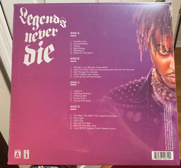 A1. Anxiety (Intro) 1:10 A2. Conversations 3:02 A3. Titanic 2:57 A4. Bad Energy 3:07 A5. Righteous 4:02 A6. Blood On My Jeans 2:35 B1. Tell Me U Luv Me 3:00 B2. Hate The Other Side 2:40 B3. Get Through It (Interlude) 0:21 B4. Life's A Mess 3:22 B5. Come & Go 3:25 C1. I Want It 2:53 C2. Fighting Demons 3:21 C3. Wishing Well 3:15 C4. Screw Juice 2:59 C5. Up Up And Away 2:28 D1. The Man, The Myth, The Legend (Interlude) 2:17 D2. Stay High 2:49 D3. Can't Die 3:03 D4. Man Of The Year 2:16 D5. Man Of The Year (999) 2:18 D6. Juice WRLD Speaks From Heaven (Outro) 0:31