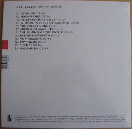 Barcode 4047179742818 Rights Society GEMA Label Code LC 13875 Matrix / Runout BC95829-01 A1 MK Matrix / Runout BC95829-01 B1 MK Mastering SID Code ifpi L573 Mould SID Code IFPI 9702 Mould SID Code IFPI 9723 Matrix / Runout AD00246-01 Matrix / Runout BB079 Karl Bartos-Off The Record,LC 13875 AD00246-01 manufactured by optimal media GmbH