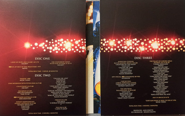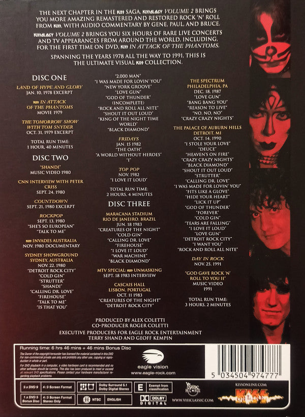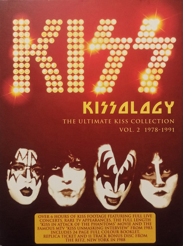 1.1. Land Of Hype And Glory - Jan. 10, 1978 Excerpt 1.2. Kiss In: Attack Of The Phantoms - Movie 1979 1.3. The Tomorrow Show With Tom Snyder - Oct. 31, 1979 Excerpt 2.1. "Shandi" - Music Video 1980 2.2. CNN Interview With Peter Criss - Sept. 24, 1980 2.3. Countdown - Sept. 21, 1980 Excerpt . Rockpop - Sept. 13, 1980 2.4. She's So European 2.5. Talk To Me 2.6. Kiss Invades Australia - Nov. 1980 Documentary . Sydney Showground, Sydney, Australia - Nov. 22, 1980 2.7. Detroit Rock City 2.8. Cold Gin 2.9. Strutter 2.10. Shandi 2.11. Calling Dr. Love 2.12. Firehouse 2.13. Talk To Me 2.14. Is That You? 2.15. 2,000 Man 2.16. I Was Made For Lovin' You 2.17. New York Groove 2.18. Love Gun 2.19. God Of Thunder (Incomplete) 2.20. Rock And Roll All Nite 2.21. Shout It Out Loud 2.22. King Of The Night Time World 2.23. Black Diamond . Fridays - Jan. 15 1982 2.24. The Oath 2.25. A World Without Heroes 2.26. I . Top Pop - Nov. 1982 2.27. I Love It loud . Maracana Stadium, Rio De Janeiro, Brazil - June, 18. 1983 3.1. Creatures Of The Night 3.2. Cold Gin 3.3. Calling Dr. Love 3.4. Firehouse 3.5. I Love It Loud 3.6. War Machine 3.7. Black Diamond 3.8. Rock And Roll All Nite 3.9. MTV Special: Kiss Unmasking - Sept. 18, 1983 Interview . Cascais Hall, Lisbon, Portugal - Oct. 11, 1983 3.10. Creaures Of The Night 3.11. Detroit Rock City . The Spectrum, Philadelphia, PA - Dec. 18, 1987 3.12. Love Gun 3.13. Bang Bang You 3.14. Reason To Live 3.15. No, No, No 3.16. Crazy Crazy Nights . The Palace Of Auburn Hills, Detroit, MI - Oct. 14, 1990 3.17. I Stole Your Love 3.18. Deuce 3.19. Heaven's On Fire 3.20. Crazy Crazy Nights 3.21. Black Diamond 3.22. Shout It Out Loud 3.23. Strutter 3.24. Calling Dr. Love 3.25. I Was Made For Lovin' You 3.26. Fits Like A Glove 3.27. Hide Your Heart 3.28. Lick It Up 3.29. God Of Thunder 3.30. Forever 3.31. Cold Gin 3.32. Tears Are Falling 3.33. I Love It Loud 3.34. Love Gun 3.35. Detroit Rock City 3.36. I Want You 3.37. Rock And Roll All Nite 3.38. Day In Rock - Nov. 25, 1991 3.39. "God Gave Rock 'N' Roll To You II" - Music Video 1991 . The Ritz, New York 13/8/1988 Crazy Nights Tour (Bonus Disc) 4.1. Deuce 4.2. Love Gun 4.3. Fits Like A Glove 4.4. Heaven's On Fire 4.5. Cold Gin 4.6. Black Diamond 4.7. Firehouse 4.8. Crazy Crazy Nights 4.9. Calling Dr. Love 4.10. War Machine 4.11. Tears Are Falling