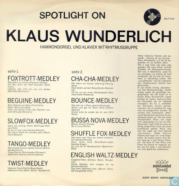 . Foxtrott-Medley A1-1. Das Gibt's Nur Einmal 1:30A1-2. Auf Dem Dach Der Welt 0:40A1-3. Liebling, Was Wird Nun Aus Uns Beiden? 1:22. Beguine-Medley A2-1. Zwei Gitarren Am Meer 1:45A2-2. Roter Mohn 1:05A2-3. Wenn Die Sonne Hinter Den Dächern Versinkt 1:15. Slowfox-Medley A3-1. Ganz Leis' Erklingt Musik 1:34A3-2. Es Ist Nur Die Liebe 1:45A3-3. Die Kleine Stadt Will Schlafen Geh'n 1:33. Tango-Medley A4-1. Man Müßte Klavier Spielen Können 1:04A4-2. Tango Marina 1:02A4-3. Nächtliche Gitarren 1:43. Twist-Medley A5-1. Valencia-Twist 1:04A5-2. Habanera-Twist (Aus Carmen) 1:29. Cha-Cha-Medley B1-1. Der Mann Am Klavier 1:21B1-2. Hoch Drob'n Auf Dem Berg 1:32B1-3. Ich Bin Nur Ein Armer Wandergesell' 0:51. Bounce-Medley B2-1. Das Hab Ich In Paris Gelernt 1:44B2-2. Komm Und Gib Mir Deine Hand 1:08B2-3. Einmal Wirst Du Wieder Bei Mir Sein 1:17. Bossa-Nova-Medley B3-1. Blauer Himmel 1:30B3-2. So In Love (Aus "Kiss Me Kate") 1:45. Shuffle-Fox-Medley B4-1. Man Kann Sein Herz Nur Einmal Verschenken 1:24B4-2. Amor, Amor, Amor 0:50B4-3. Du Und Ich Im Mondenschein 1:25. English-Waltz-Medley B5-1. Coppelia-Waltz (Aus Der Coppelia-Suite) 1:13B5-2. Kleine Melodie, Dich Vergeß Ich Nie 0:58B5-3. Sag' Beim Abschied Leise Servus 1:39