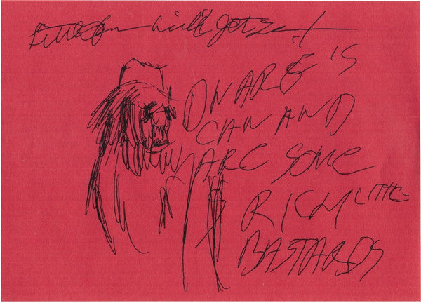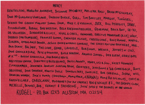 White two-piece sleeve, issued with red paper insert with artwork, thank-yous, and contact address.