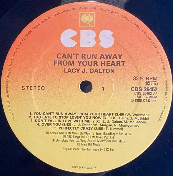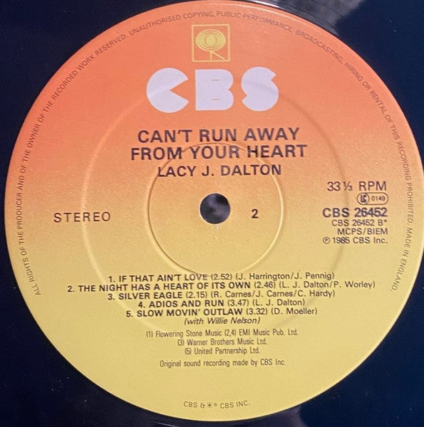 A1. You Can't Run Away From Your Heart 3:46 A2. Too Late To Stop Lovin' You Now 3:19 A3. Don't Fall In Love With Me 2:50 A4. Over You 3:42 A5. Perfectly Crazy 2:58 B1. If That Ain't Love 2:52 B2. The Night Has A Heart Of Its Own 2:46 B3. Silver Eagle 2:15 B4. Adios And Run 3:47 B5. Slow Movin' Outlaw 3:32