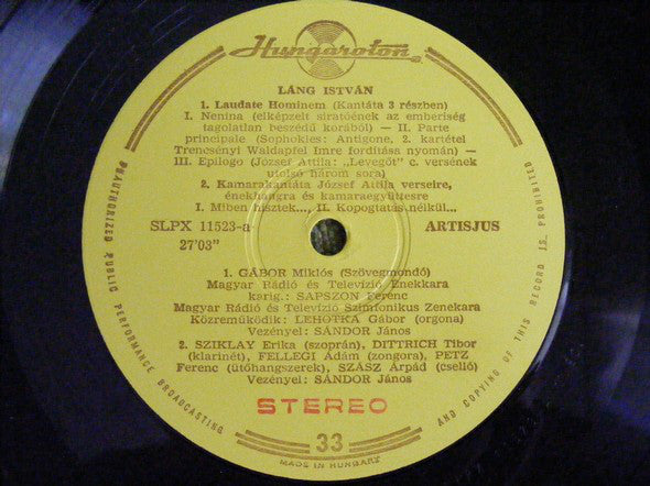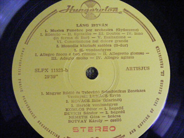István Láng (b. 1933), an outstanding talent among presentday Hungarian composers, studied at the Budapest Academy Of Music as a pupil of János Viski and then of Ferenc Szabó. Since 1958, he has been occupied with new musical trends, and during the last decade, many of his modern orchestral and chamber compositions have been featured in the programmes of European concerts and radio stations. For years he has also been the music director of the State Puppet Theatre.