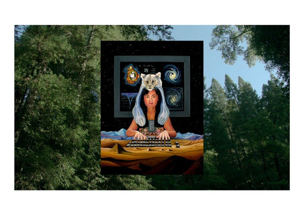 In the frame, Lynn Randolph's "Cyborg" illustration, which appeared on the cover of the original edition of "Simians, Cyborgs and Women - The Reinvention of Nature" by Donna Haraway, overlaid with images of a forest.