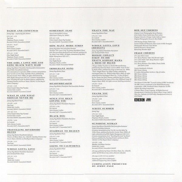 A1. You Shook Me 5:14 A2. I Can't Quit You Baby 4:22 A3. Communication Breakdown 3:12 A4. Dazed And Confused 6:39 B1. The Girl I Love She Got Long Black Wavy Hair 3:00 B2. What Is And What Should Never Be 4:20 B3. Communication Breakdown 2:40 B4. Travelling Riverside Blues 5:12 C1. Whole Lotta Love 6:09 C2. Somethin' Else 2:06 C3. Communication Breakdown 3:05 C4. I Can't Quit You Baby 6:21 D1. You Shook Me 10:19 D2. How Many More Times 11:51 E1. Immigrant Song 3:20 E2. Heartbreaker 5:16 E3. Since I've Been Loving You 6:56 E4. Black Dog 5:17 F. Dazed And Confused 18:36 G1. Stairway To Heaven 8:49 G2. Going To California 3:54 G3. That's The Way 5:43 H1. Whole Lotta Love (Medley): Boogie Chillun' / Fixin' To Die / That's Alright Mama / A Mess Of Blues 13:45 H2. Thank You 6:37 I1. Communication Breakdown 3:00 I2. What Is And What Should Never Be 4:15 I3. Dazed And Confused 11:08 I4. White Summer 8:23 J1. What Is And What Should Never Be 4:44 J2. Communication Breakdown 4:55 J3. I Can't Quit You Baby 5:27 J4. You Shook Me 4:10 J5. Sunshine Woman 3:06