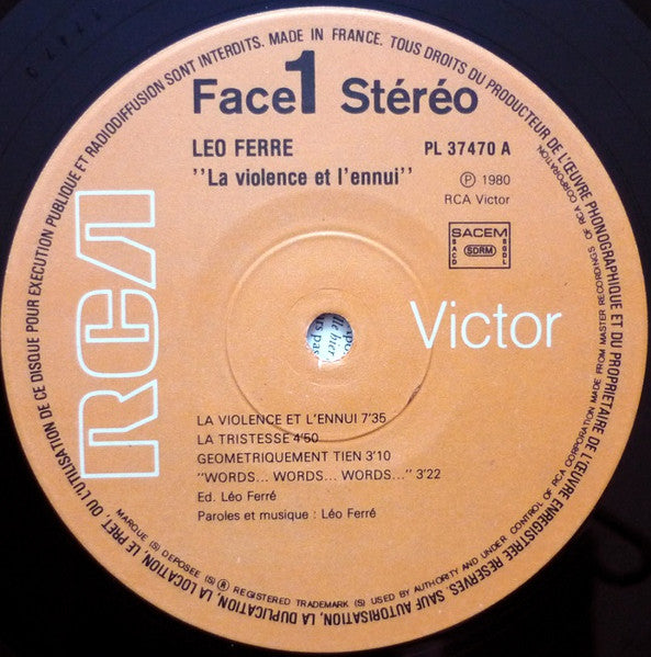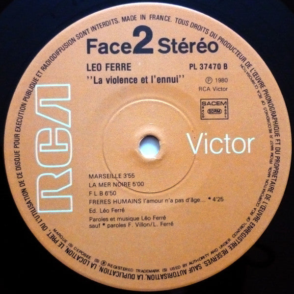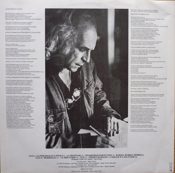 A1. La Violence Et L'ennui 7:35 A2. La Tristesse 4:50 A3. Géométriquement Tien 3:10 A4. Words... Words... Words... 3:22 B1. Marseille 3:55 B2. La Mer Noire 5:00 B3. FLB 6:50 B4. Frères Humains & L'amour N'a Pas D'âge 4:25