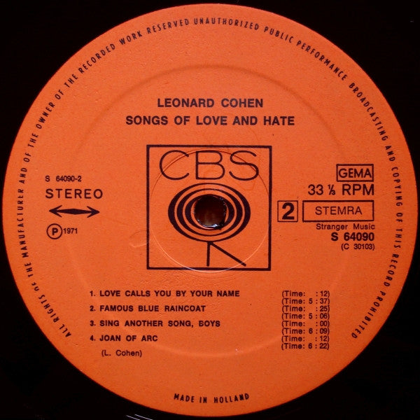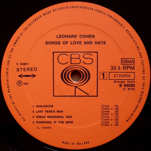 A1. Avalanche 4:59 A2. Last Year's Man 5:58 A3. Dress Rehearsal Rag 6:02 A4. Diamonds In The Mine 4:00 B1. Love Calls You By Your Name 5:37 B2. Famous Blue Raincoat 5:06 B3. Sing Another Song, Boys 6:09 B4. Joan Of Arc 6:22