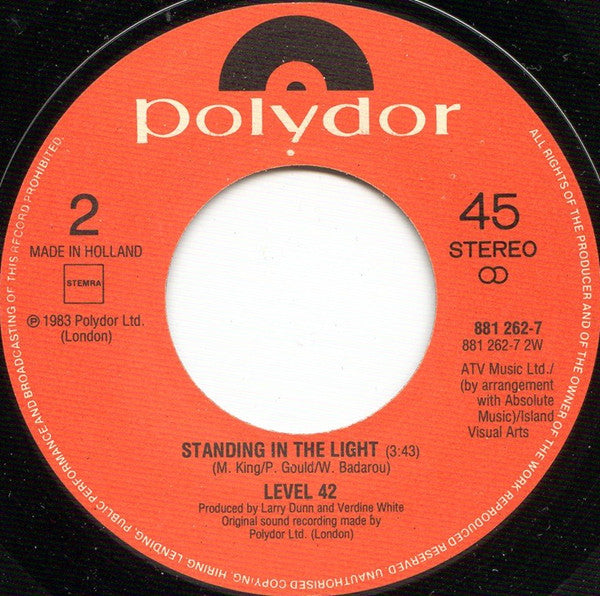 Made in Holland. Track A published by Chappell Music Ltd. / Level 42 Music Ltd. / Island Visual Arts ℗©1984 Polydor Ltd. (London) Taken from the album 'True Colours' Track B published by ATV Music Ltd. / (by arrangement with Absolute Music) / Island Visual Arts ℗1983 Polydor Ltd. (London) ©1984 Polydor Ltd. (London) Taken from the album 'Standing In The Light'