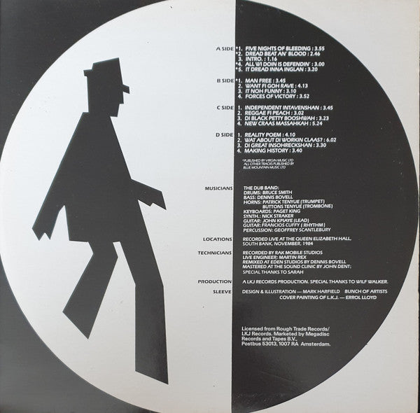 A1. Five Nights Of Bleeding 3:55 A2. Dread Beat An' Blood 2:46 A3. Intro 1:16 A4. All Wi Doin Is Defendin' 3:00 A5. It Dread Inna Inglan 3:20 B1. Man Free 3:45 B2. Want Fi Goh Rave 4:13 B3. It Noh Funny 3:10 B4. Forces Of Victory 3:52 C1. Independent Intavenshan 3:45 C2. Reggae Fi Peach 3:02 C3. Di Black Petty Booshwah 3:23 C4. New Craas Massahkah 5:24 D1. Reality Poem 4:10 D2. Wat About Di Workin Claas? 6:02 D3. Di Great Insohreckshan 3:30 D4. Making History 3:40