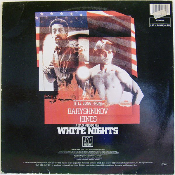 Side A: Brockman Music (ASCAP) ℗ 1985 Motown Record Corp. Title song from "White Nights" Side B: Brockman Music K-Dave's Music (ASCAP) ℗ 1983 Motown Record Corp. In Album "Can't Slow Down" STMA 8041 ZL72020 All timings are approximate. Printed in West Germany. ℗ 1985 Motown Record Corporation Front Cover © 1985 Motown Record Corporation. Back Cover © 1985 Columbia Pictures Industries, Inc.