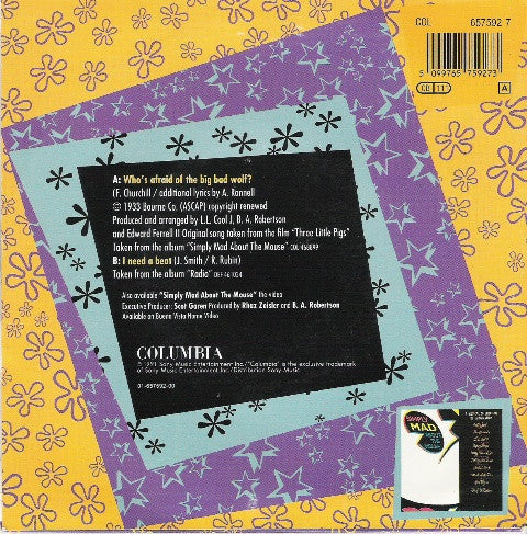 A: Original song taken from the film "Three Little Pigs". Taken from the album "Simply Mad About The Mouse" (COL 468899). Also available "Simply Mad About The Mouse" the video. Executive Producer: [a4683466 Produced by: [a4683467 and [a270239. Available on [l336185. B: Taken from the album "Radio" (DEF 461034). A: Bourne Co. B: Def Jam Artist on cover: LL Cool J on labels: L.L. Cool J NOTE: the title of the release is "Whose Afraid Of The Big Bad Wolf?" and the title of the track is "Who's Afraid Of The Big Bad Wolf?" Made in Holland.