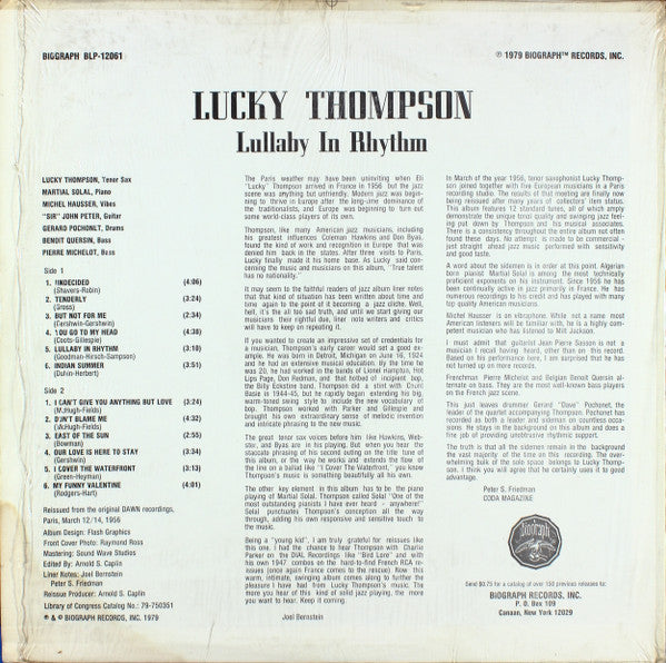 A1. Undecided 4:06 A2. Tenderly 3:24 A3. But Not for Me 2:34 A4 . You Go To My Head 4:38 A5. Lullaby in Rhythm 3:10 A6. Indian Summer 3:51 B1. I Can't Give You Anything But Love 3:24 B2. Don't Blame Me 4:32 B3. East of the Sun 2:55 B4. Our Love is Here to Stay 3:34 B5. I Cover the Waterfront 3:13 B6. My Funny Valentine 4:01