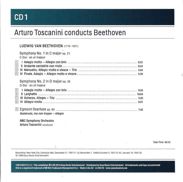 . Symphony No. 1 In C Major, Op. 21 1-1. I - Adagio Molto 8:221-2. II - Andante Cantabile Con Moto 6:241-3. III - Menuetto: Allegro Molto E Vivace 3:241-4. IV - Adagio - Allegro Molto E Vivace 5:39. Symphony No. 2 In D Major, Op. 36 1-5. I - Adagio Molto - Allegro Con Brio 9:241-6. II - Larghetto 10:041-7. III - Scherzo - Trio 3:201-8. IV - Allegro Molto 6:01. - 1-9. Egmont Overture, Op. 84 7:45. Symphony No. 3 In E-flat Major, Op. 55 "Eroica" 2-1. I - Allegro Con Brio 14:102-2. II - Marcia Funebre: Adagio Assai 15:232-3. III - Scherzo: Allegro Vivace - Trio 5:272-4. IV - Finale: Allegro Molto - Poco Andante - Presto 11:14. Symphony No. 4 In B-flat Major, Op. 60 2-5. I - Adagio - Allegro Vivace 9:582-6. II - Adagio 8:482-7. III - Menuetto: Allegro Vivace 5:002-8. IV - Allegro Ma Non Troppo 6:56. Symphony No. 5 In C Minor, Op. 67 3-1. I - Allegro Con Brio 7:183-2. II - Andante Con Moto 9:003-3. III - Allegro 4:383-4. IV - Allegro 8:27. Symphony No. 6 In F Major, Op. 68 "Pastorale" 3-5. I - Erwachen heiterer Gefühle bei der Ankunft auf dem Lande. Allegro ma non troppo 11:533-6. II - Szene am Bach. Andante molto moto 11:333-7. III - Lustiges Zusammensein der Landleute. Allegro 5:013-8. IV - Gewitter. Sturm. Allegro 3:313-9. V - Hirtengesang. Frohe und dankbare Gefühle nach dem Sturm. Allegretto 8:46. Symphony No. 7 In A Major, Op. 92 4-1. I - Poco Sostenuto - Vivace 11:084-2. II - Allegretto 7:594-3. III - Presto - Assai Meno Presto - Presto 6:574-4. IV - Allegro Con Brio 6:45. Symphony No. 8 In F Major, Op. 93 4-5. I - Allegro Vivace E Con Brio 9:304-6. II - Allegretto Scherzando 3:434-7. III - Tempo Di Menuetto 4:434-8. IV - Allegro Vivace 7:24. Symphony No. 9 In D Major, Op. 125 5-1. I - Allegro Ma Non Troppo, Un Poco Maestoso 13:305-2. II - Molto Vivace 13:095-3. III - Adagio Molto E Cantabile; Andante Moderato 14:215-4. IV - Presto; Allegro Assai; Presto 23:24. Missa Solemnis, Op. 123 6-1. I - Kyrie - Assai Sostenuto. Mit Andacht 9:056-2. II - Gloria - Allegro Vivace 16:026-3. III - Credo - Allegro Ma Non Troppo 17:586-4. IV - Sanctus - Adagio. Mit Andacht 16:326-5. V - Agnus Dei - Adagio 14:40