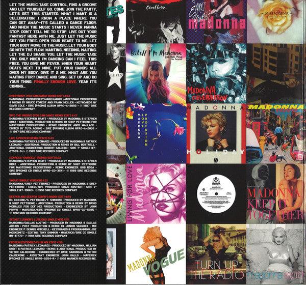 A1. Madonna - Everybody (You Can Dance Remix Edit) 4:34 A2. Madonna - Into The Groove (You Can Dance Remix Edit) 4:47 A3. Madonna - Like A Prayer (Remix/Edit) 5:43 A4. Madonna - Express Yourself (Remix/Edit) 5:02 . 90s B1. Madonna - Vogue (Single Version) 4:21 B2. Madonna - Deeper And Deeper (David's Radio Edit) 4:04 B3. Madonna - Secret (Junior's Luscious Single Mix) 4:15 B4. Madonna - Frozen (Extended Club Mix Edit) 4:38 . 00s C1. Madonna - Music (Deep Dish Dot Com Radio Edit) 4:14 C2. Madonna - Hollywood (Calderone & Quayle Edit) 4:02 C3. Madonna - Hung Up (SDP Extended Vocal Edit) 4:59 C4. Madonna - Give It 2 Me (Eddie Amador Club 5 Edit) 4:56 . 10s D1. Madonna - Girl Gone Wild (Avicii's UMF Mix) 5:15 D2. Madonna - Living For Love (Offer Nissim Promo Mix) 5:52 D3. Madonna, Maluma - Medellín (Offer Nissim Madame X In The Sphinx Mix) 5:29 D4. Madonna - I Don't Search I Find (Honey Dijon Radio Mix) 5:22