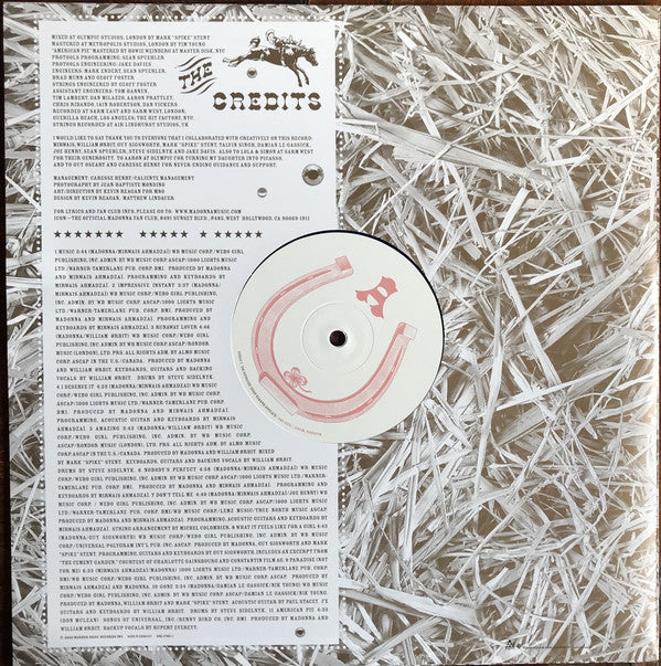 Made in Germany. Black sticker: "Featuring The Hit Singles Music & American Pie 9362-47865-1". Catalogue number listed as 9362-47865-1 on sticker and back of cover; 1-47865 on labels. Marketed as a Sainsbury's exclusive release for the UK. UK release date 26/10/18. Also distributed in France exclusively in FNAC shops (from November 23rd) with sticker "FNAC édition spéciale vinyle bleu" . Also sold by Amazon. Side B label contains a misprint in both 2000 and 2018 (Blue Vinyl) pressings: "SDIE TWO" instead of SIDE TWO.